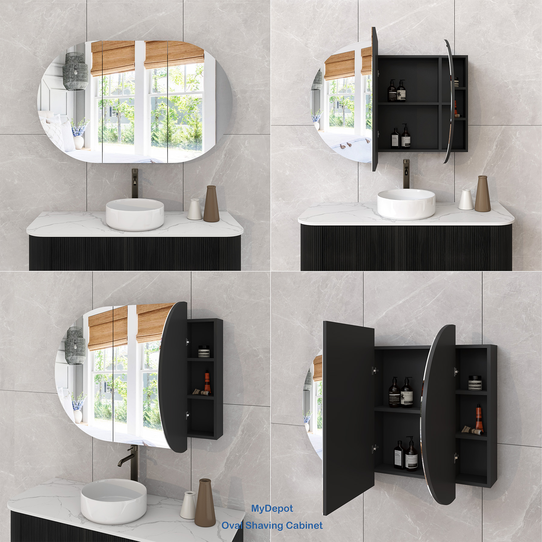 1200x750mm Oval Matte Black MDF 3/DR Shaving Cabinet