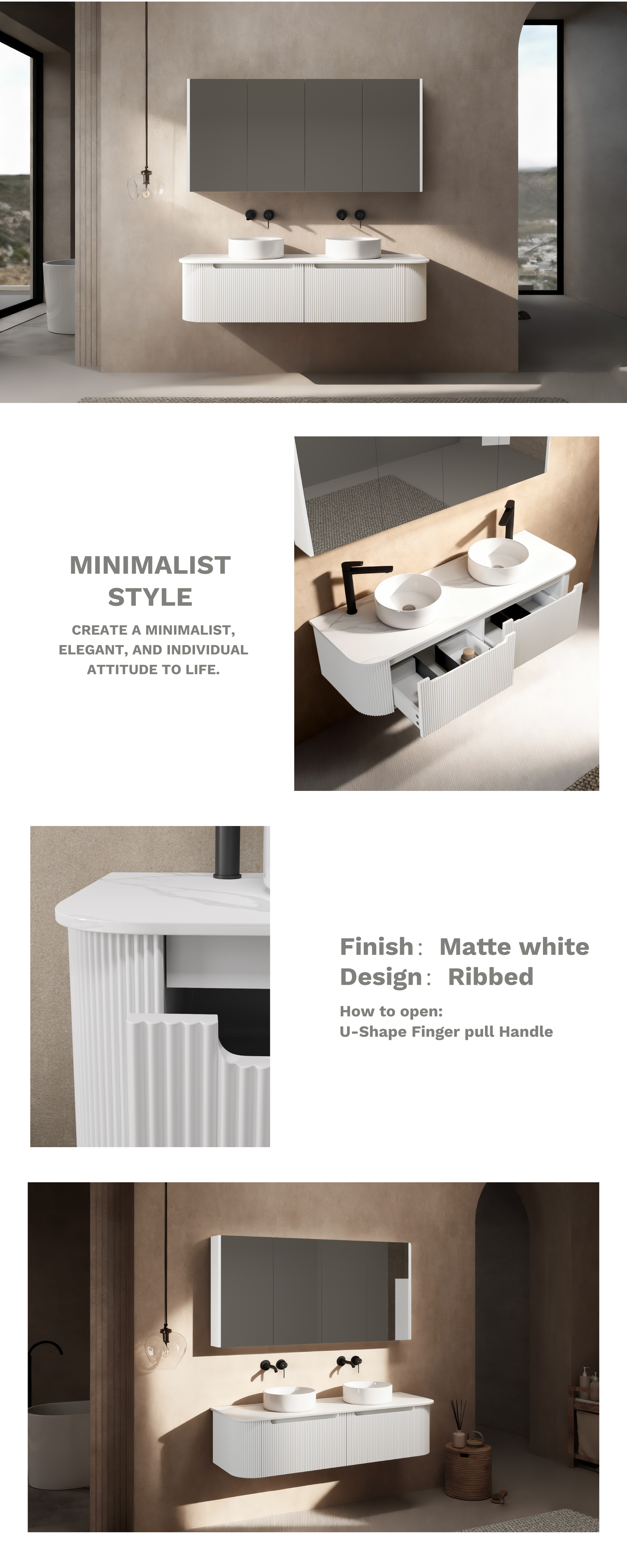 1500mm Matte White 2PAC PVC 2/DW Curved Ribbed Design Wall Hung Cabinet Only