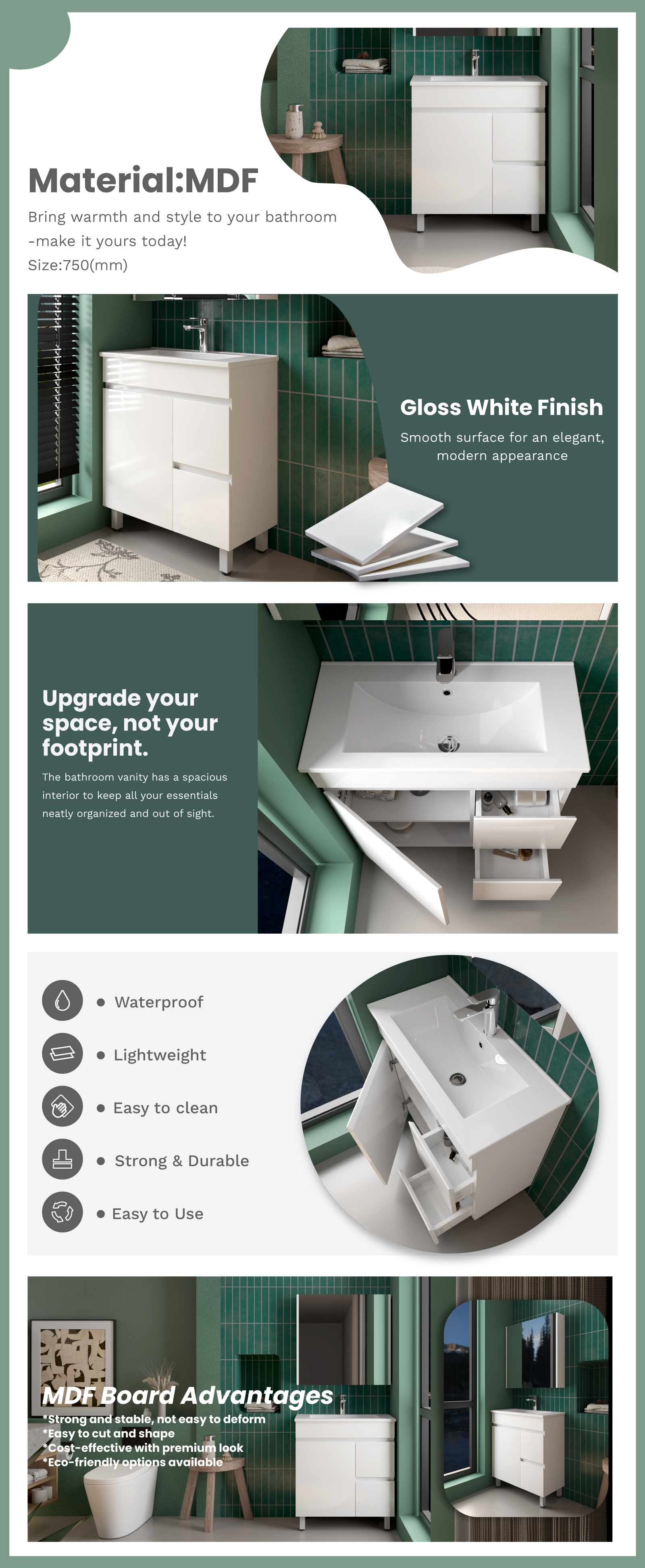 750MM Narrow Gloss White MDF Bathroom Vanity Right Drawers Free standing Cabinet Only