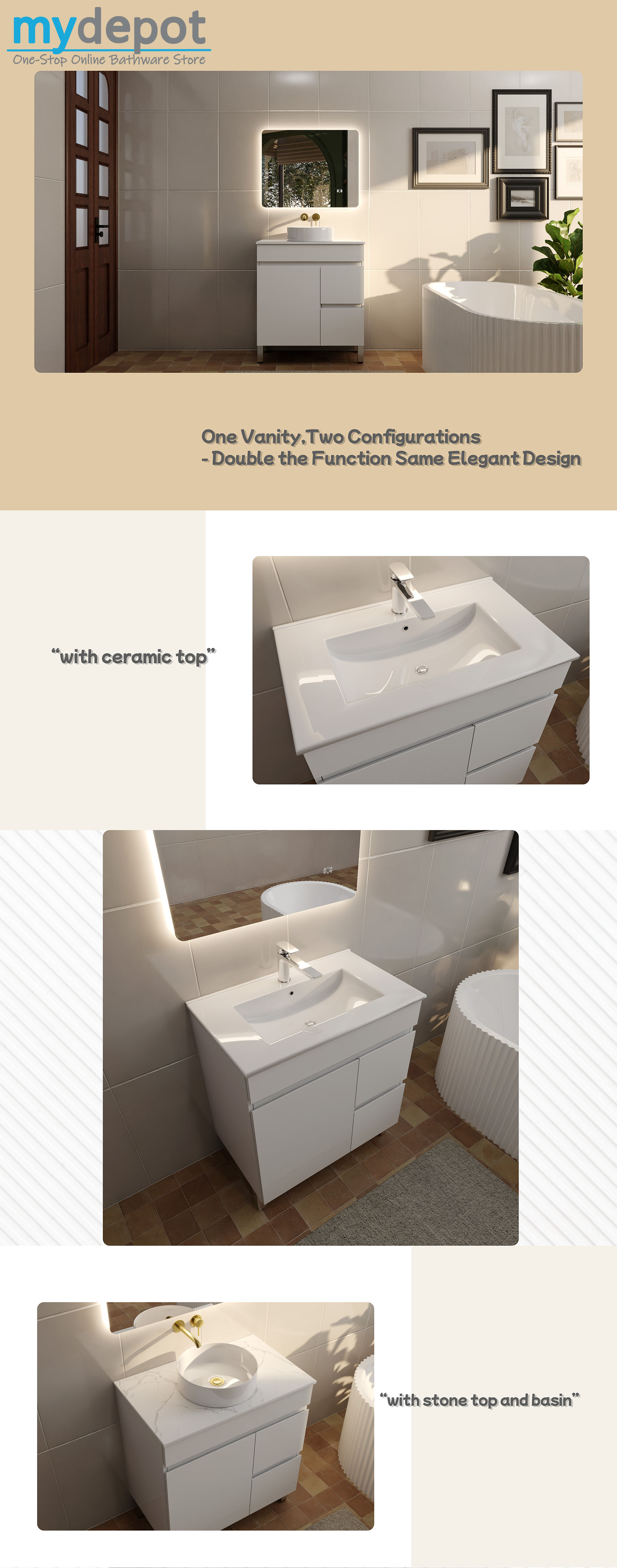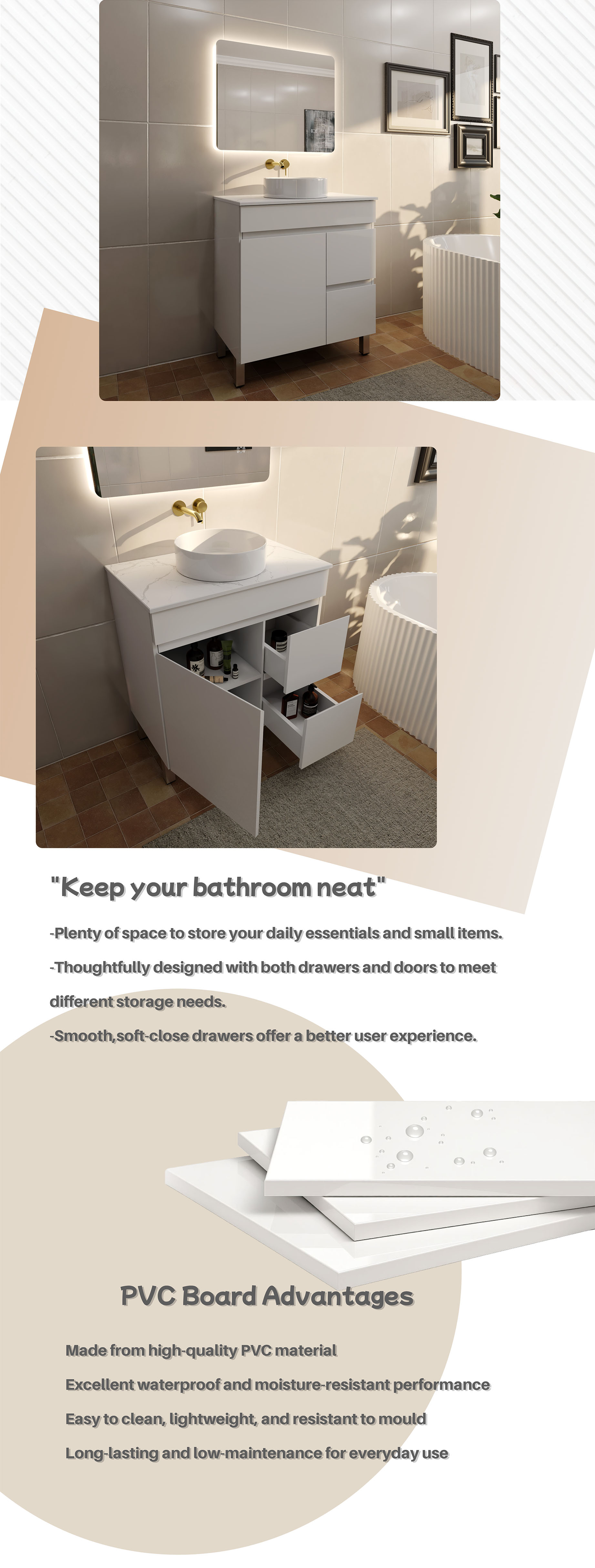 750MM Narrow Gloss White PVC Bathroom Vanity Right Drawers Free standing Cabinet Only